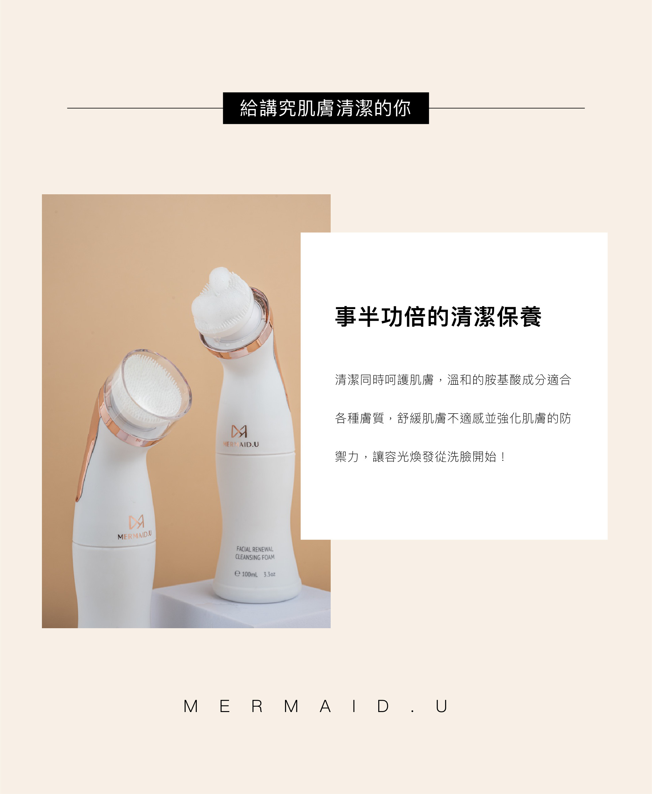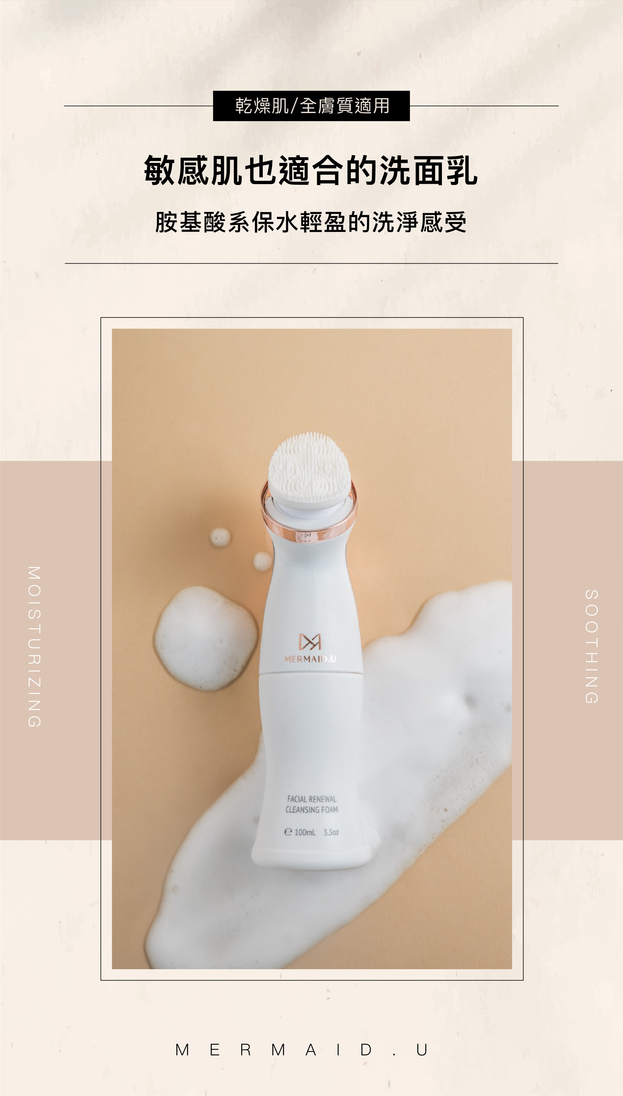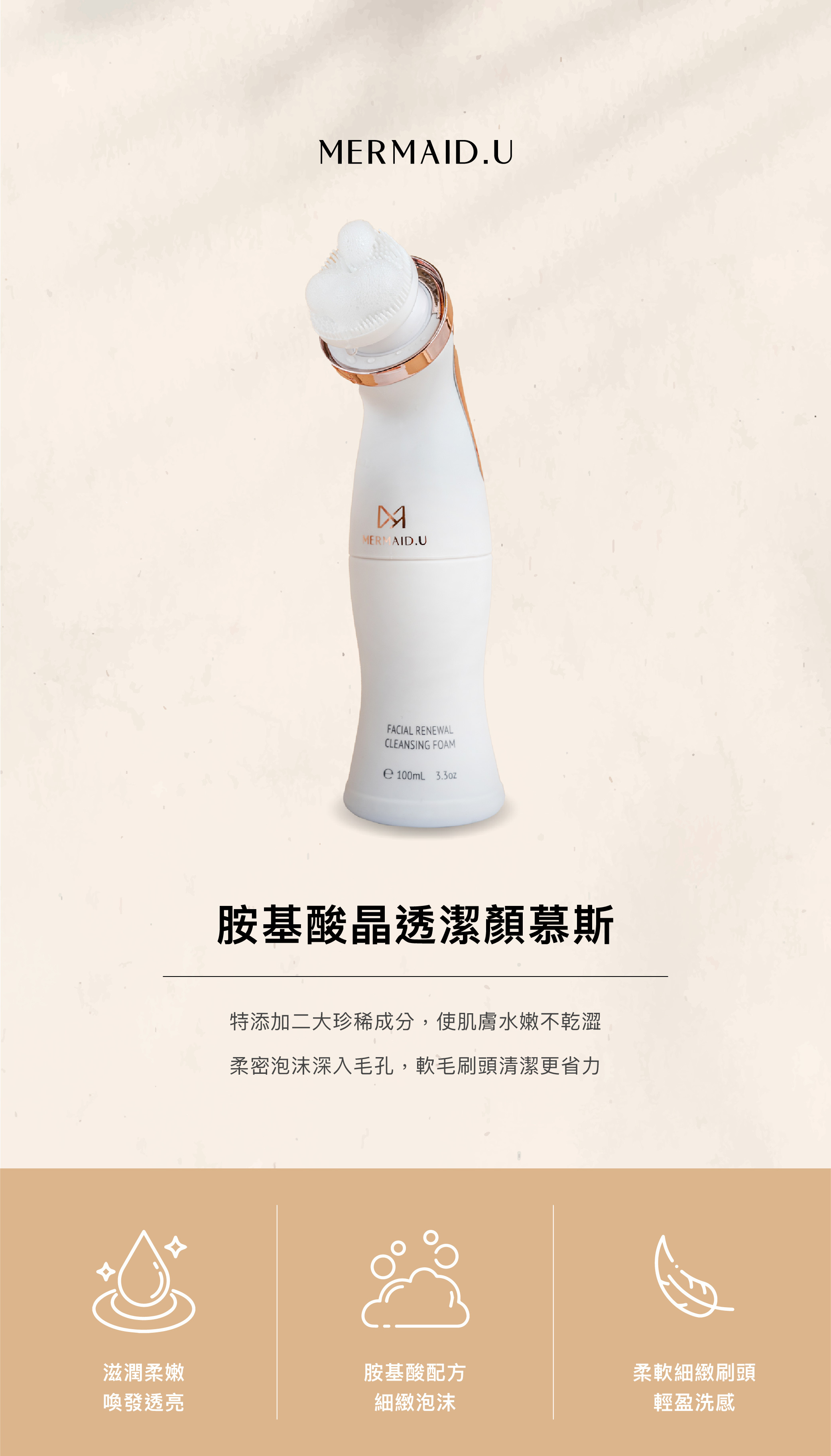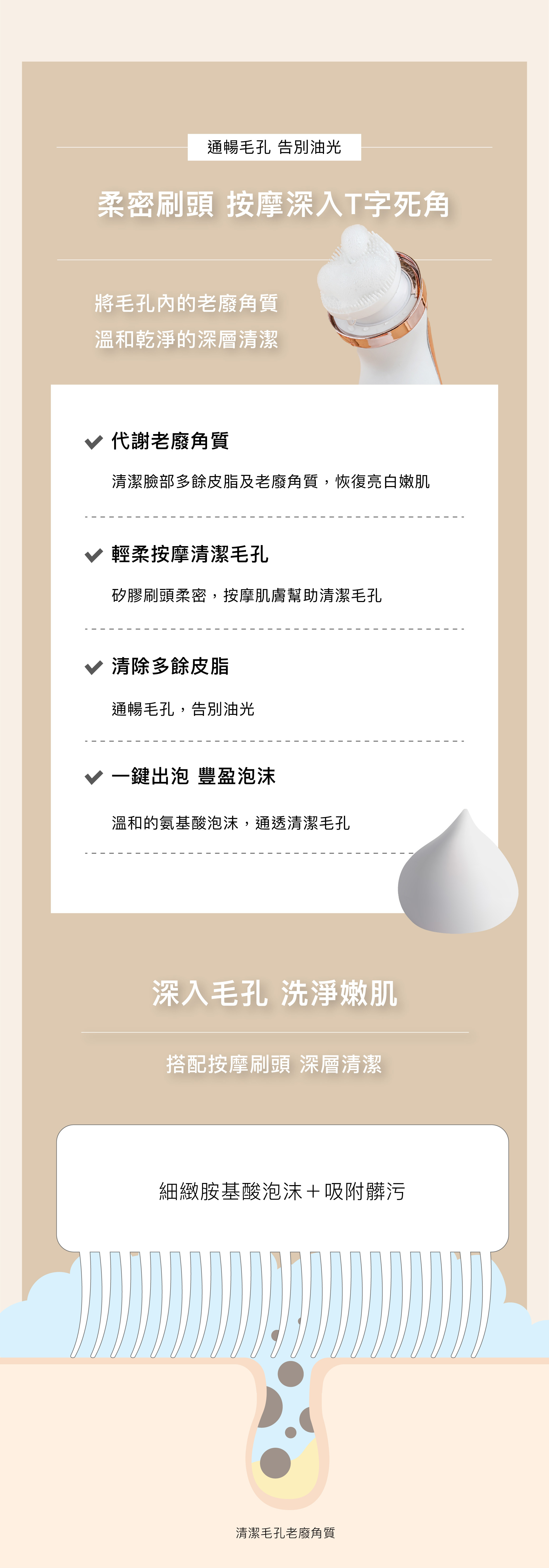 使用方法:擠壓適量泡沫,輕柔塗抹按摩肌膚,搭配按摩刷頭,再用清水洗淨即可