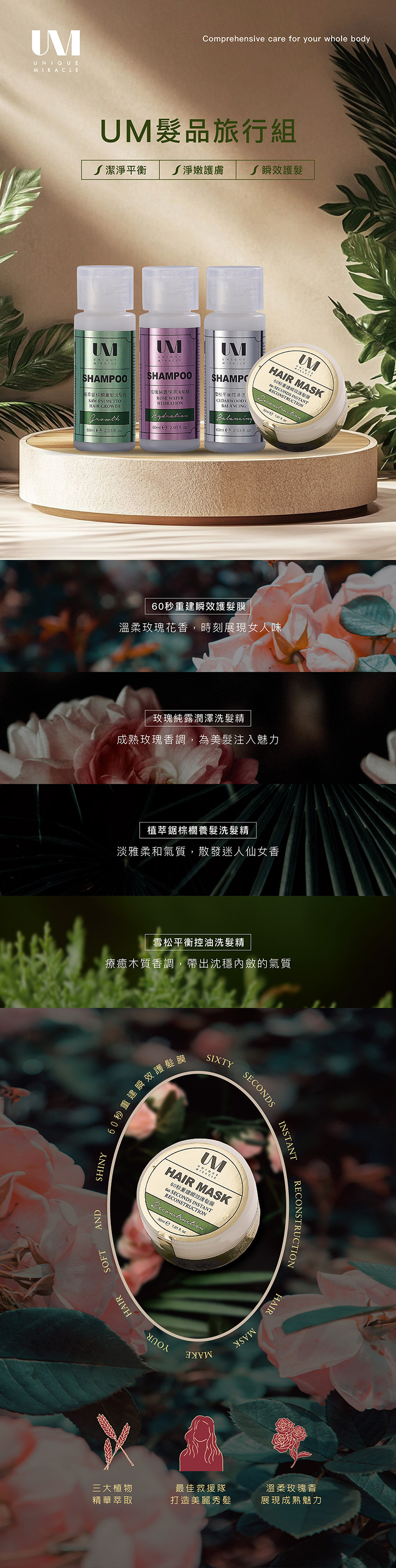 UM髮品旅行組,髮品任選三件75折+贈可穿式浴巾(價值$399)