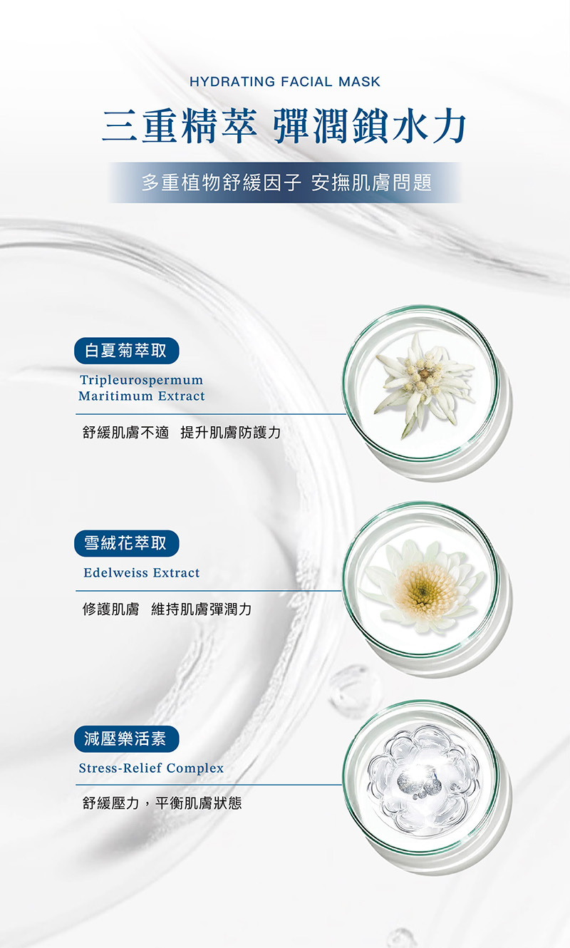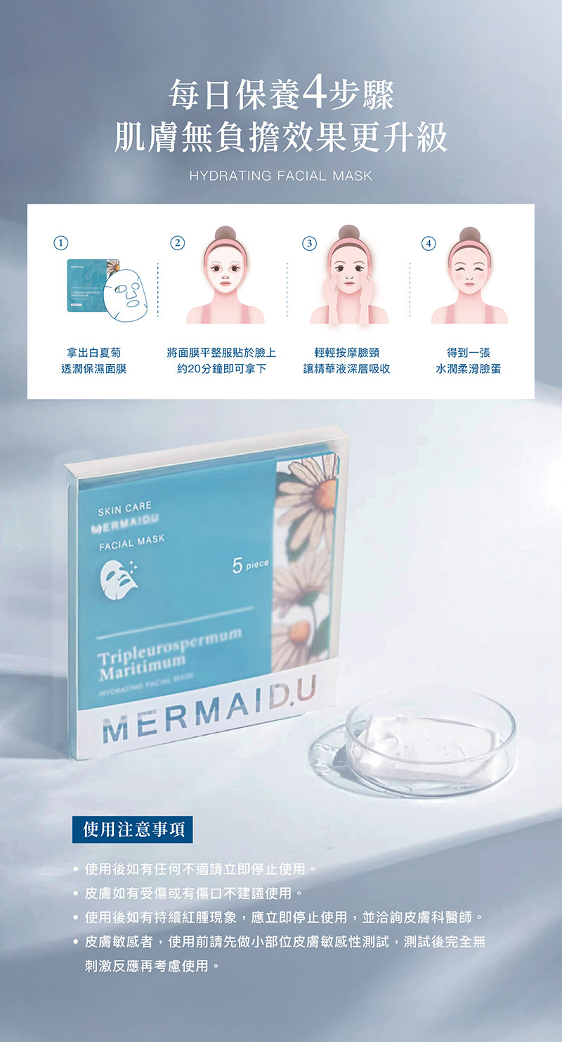 使用方法:臉部清潔後,取出面膜,完整貼附於臉部肌膚,靜待15-20分鐘後